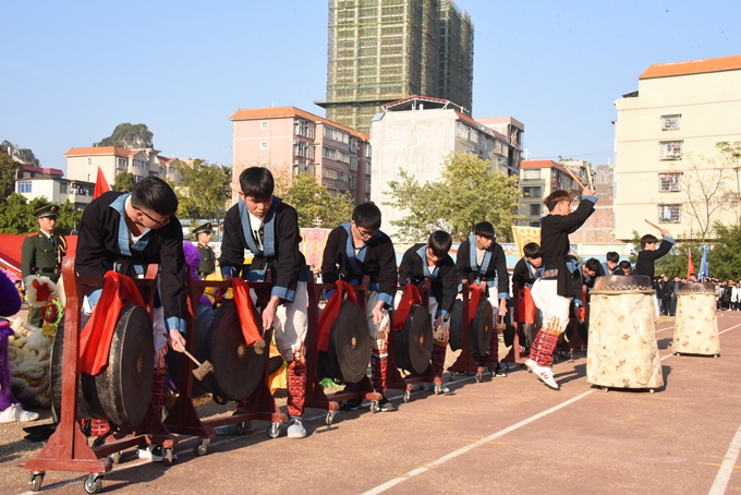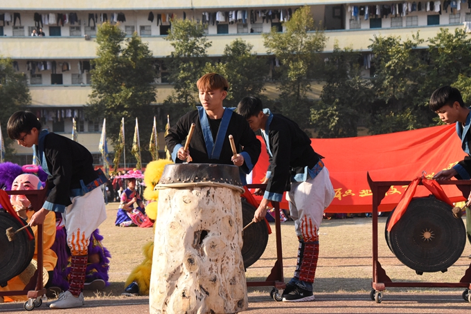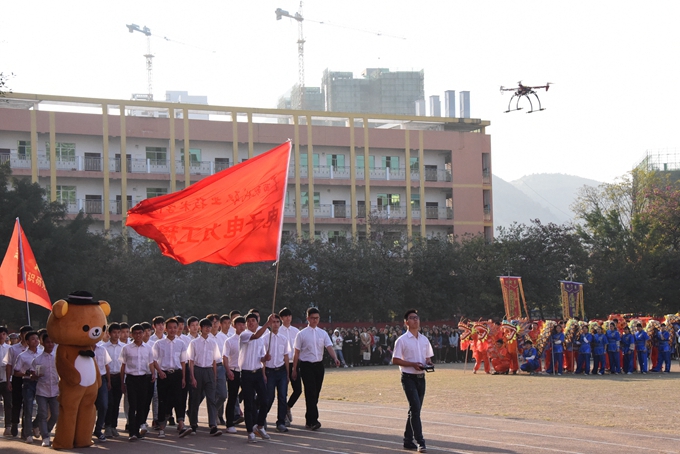 在开幕式上,大型花伞摆字表演呈现出“壮乡美”几个大字,龙狮队和各社团为现场观众带来精彩纷呈的表演;师生们身着民族服饰展示才艺,为文化艺术节添彩;各系学生也展示自制的旋翼无人机、民族手工作品和电子类作品等。