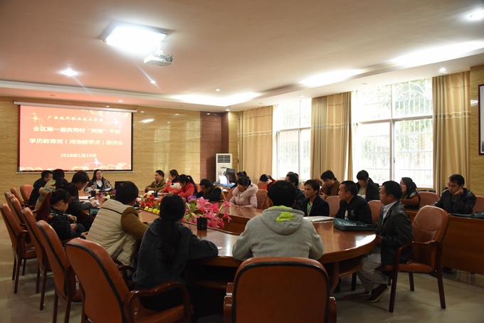 在广西广播电视大学、河池市委组织部和广西现代职业技术学院的精心策划和组织下,1月15日至20日,全区第一届优秀村“两委”干部中专学历函授教育(河池电大教学点)培训班在我院举办。来自河池市120余名村“两委”成员参加了培训。