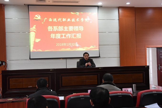 1月30日,我院在第二学术报告厅召开各系部主要领导年度述职暨2017年秋季学期期末总结会。学院院长黄绍光、副院长韦胜东、纪委书记冉景峰、工会主席覃志航出席会议。会议由副院长韦胜东主持。