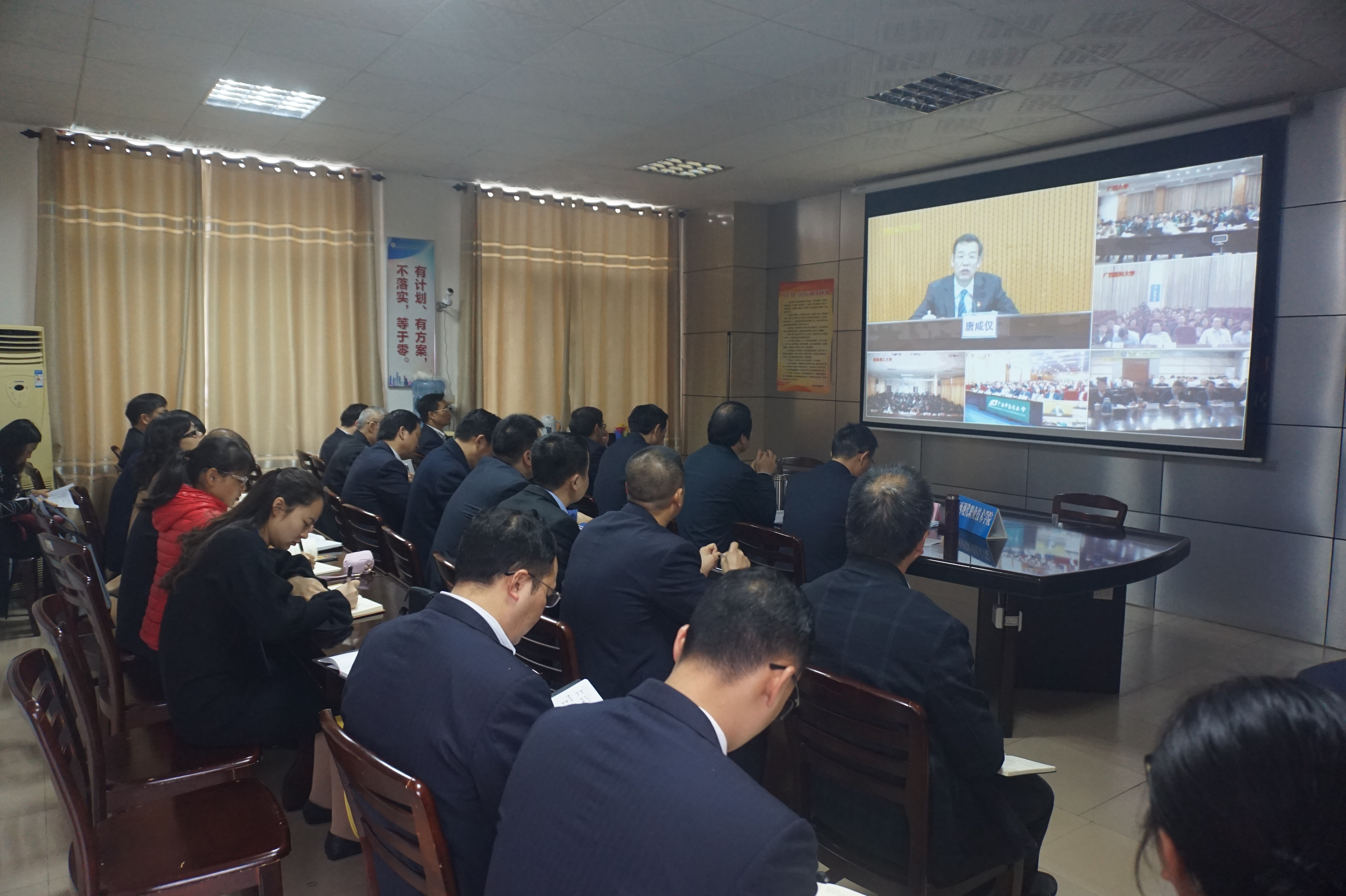 3月12日上午,2018年全区教育系统全面从严治党工作视频会议在自治区教育厅主会场召开,我院设分会场组织参加。院长黄绍光、副院长韦胜东、副院长冯忠伟、纪委书记冉景峰,以及学院各系部中层正职领导参加会议。