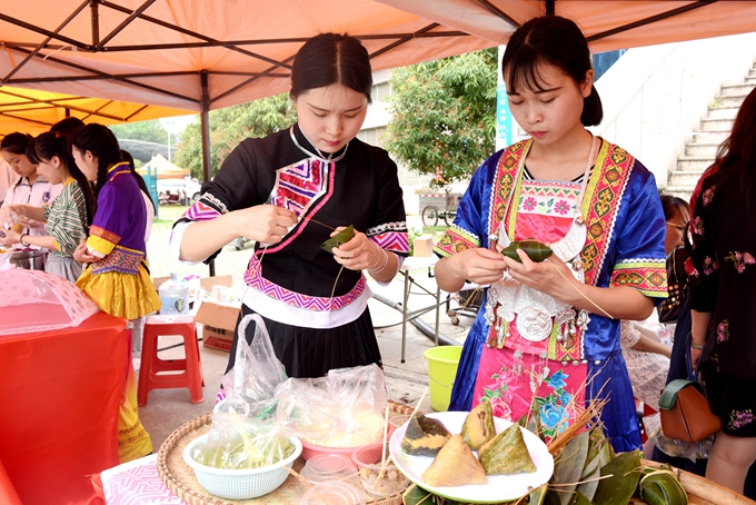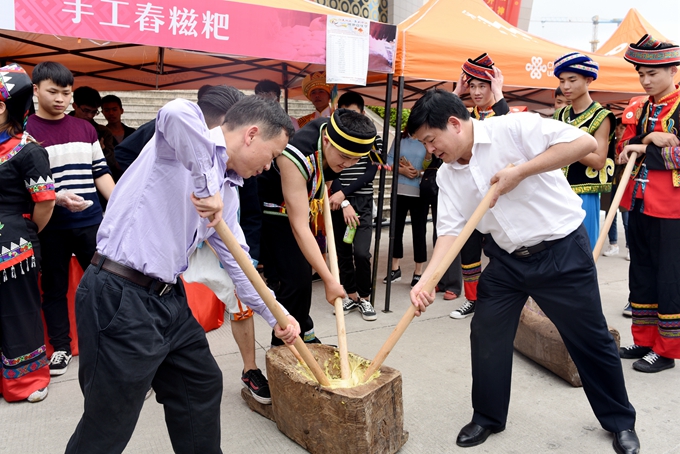 每逢“三月三”,壮乡特色美食尤其深受人们喜爱。在活动现场,五色糯米饭、民族艺术彩蛋、龙蹦、巴马香粽、河池世遗鸭粑、纯香豆腐圆、风味酸鸡脚、粉蒸肉、清香艾叶粑……这些挑人味蕾的美食集结了河池各地本土特色传统,市民们在大快朵颐享受美食的同时,还可以听讲解员将每一种特色美食的由来、做法娓娓道来,体验不一样的美食文化;现场还邀请观众磨豆腐花、舂糍粑,体验农耕民俗;民族花式调酒、民族风情摆台、民俗茶艺也将民族风情和技艺功底完美呈现。