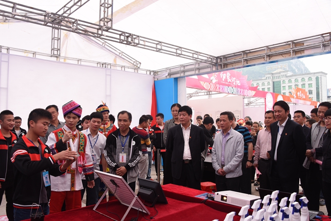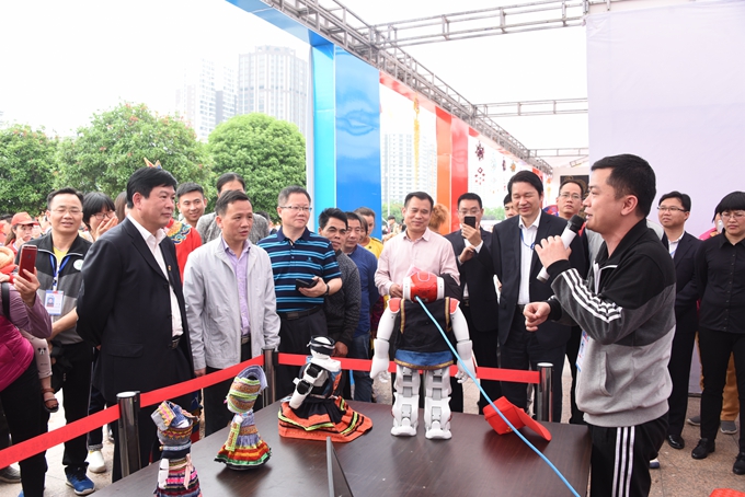 河池本土铜鼓造型、河池毛竹编制器皿、河池民族服饰刺绣产品、河池景色水墨画等,这些精美展品在充分体现河池民俗特点的同时,着实让观众在“印象河池”中大饱眼福;由我院教育系学前教育专业学生呈现的“剪纸”、“泥塑”、“景泰蓝工艺画”、“立体浮雕”、“立体纸雕”、“立体折纸”、“民族绘画”、“竹筷民族手工”等形式的匠心之作,依托中国传统文化、河池少数民族文化和现代文化艺术的结合,展示民族艺术之美,让“多彩河池”彰显魅力;以歌舞表演为主要形式的“壮族蚂拐歌舞”、“瑶族勤泽格拉”两个国家级非物质文化遗产,展示了河池红水河流域丰富多彩的壮族民俗文化、白裤瑶文化的神秘色彩,“世遗河池”尽得传承;身穿民族服饰的超人气“智能机器人”、VR虚拟仿真、3D打印技术、无人机编程、智能家居等现代先进技术与民族风情相结合,让观众体验到现代与传统完美结合的视觉震撼,“创新河池”大展未来。