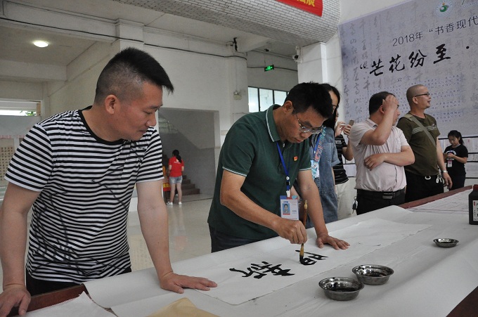 开幕式结束后,出席活动的领导、嘉宾和现场师生一起参观展览作品。冉景峰书记与各位书法家现场题字,笔墨饱蘸激情,笔韵行云流水,展示了高超的书法造诣,赢得了大家热烈的掌声。