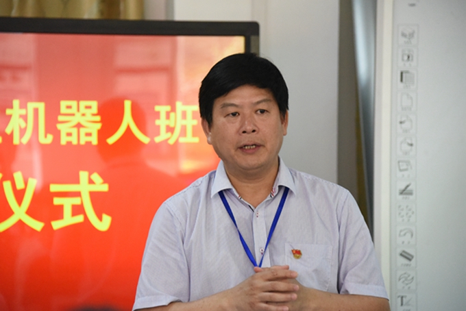 学院党委书记、市职业教育中心学校校长韦伟松在开班仪式上讲话。韦伟松指出,随着中国智能工业的升级调整,机器人在智能制造中的作用越来越突出,市场对此类人才的需求非常巨大,产业发展前景广阔。我院和市职业教育中心学校在提升工业机器人技术专业人才培养的基础上,努力在学生中培养后备力量,选拔出有兴趣爱好、基础较好的29名学生组建了首届工业机器人技术精英班,这是积极响应国家智能制造的发展要求,也是学院实现快速稳健发展的需要。韦伟松强调,这个时代造就大国工匠,新时代更需要大国工匠。精英班全体学生要有目标、有高度,要自信、要认真,要坚持、要出彩;要认真对待自己的选择,利用好这个平台,认真学习相关专业知识,为以后的工作打下坚实基础。韦伟松希望,两校机器人团队教师不仅要注重对学生的培养,还要全方位、多维度创新专业课程体系,将教学工作与企业需求无缝对接,努力培养高素质专业化的精英人才。