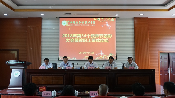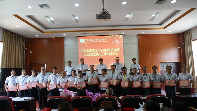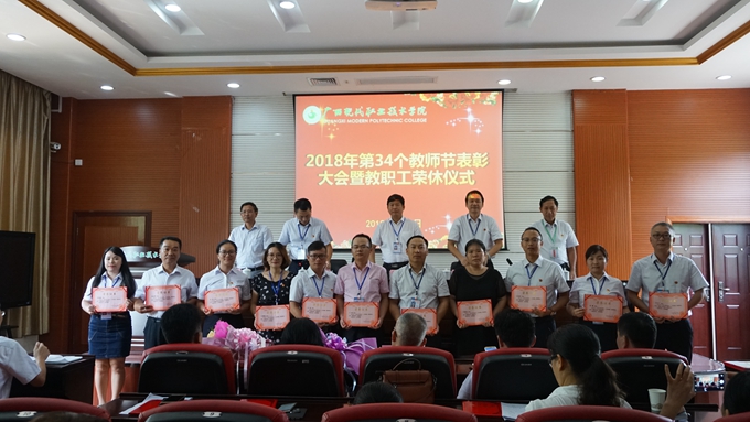 第34个教师节即将到来之际,我院于9月6日下午在第二报告厅召开2018年教师节表彰大会暨教职工荣休仪式,对过去一年先进集体、优秀教师、优秀教育工作者、优秀班主任、学生技能竞赛优秀指导教师、培训工作先进个人、项目建设突出贡献奖和教学标兵等进行表彰授奖,为光荣退休的教职工送上祝福。学院党委书记韦伟松、院长黄绍光,党委副书记、副院长霍江华,副院长韦胜东、副院长冯忠伟出席会议。全体教职工参加会议。会议由学院党委副书记、副院长霍江华主持。