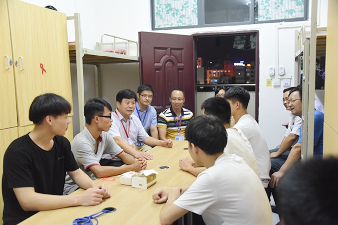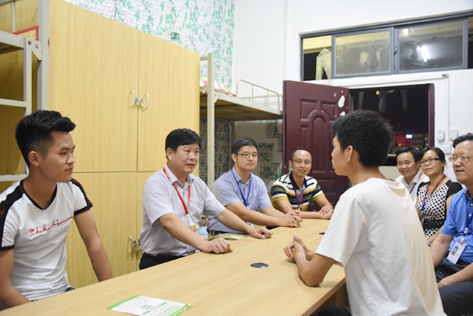 在金风送爽的九月,我院迎来了2018级新生。为了解我院新生住宿和生活情况,引领新生尽快适应新生活新环境,9月12日晚,学院党委书记韦伟松、院长黄绍光,党委副书记、副院长霍江华,副院长韦胜东、副院长冯忠伟分别带队走访我院各宿舍区,看望2018级新生,表达学院对新生的关爱,为新生带去在校如家般的温暖。