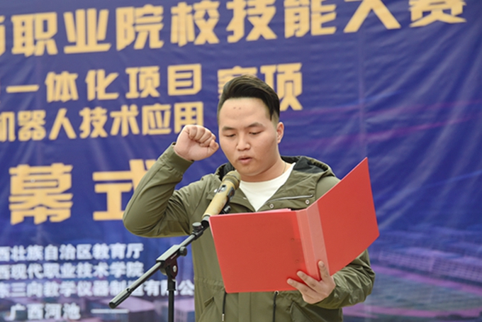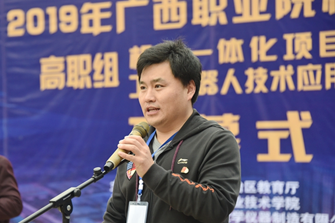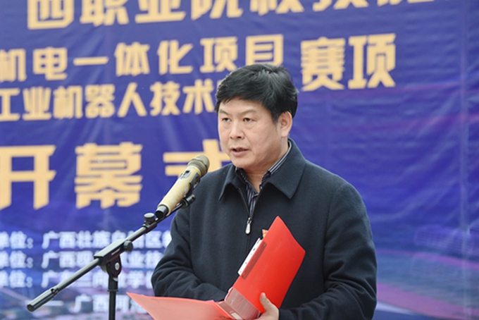 3月27日下午,由自治区教育厅主办、我院承办的2019年广西职业院校技能大赛高职组“工业机器人技术应用”、“机电一体化项目”赛项启动仪式在田径场举行。学院党委书记韦伟松、院长黄绍光,党委副书记、副院长霍江华出席仪式。来自全区各职业院校参赛师生以及学院全体师生参加仪式。仪式由副院长韦胜东主持。 院长黄绍光在启动仪式上致辞。黄绍光指出,举办职业院校技能大赛,是对职业教育发展成果的大检阅,是对职业院校广大师生奋发向上、锐意进取精神风貌的大展示,对于进一步宣传职业教育、营造良好社会发展氛围,推动职业教育又好又快发展具有十分重要的意义。黄绍光表示,此次技能大赛必将成为各兄弟院校相互交流的良好平台,成为兄弟院校加快发展、科学发展的助推器。学院一定当好东道主,为领导嘉宾和选手提供最优质的服务,办出高水平、高质量、安全有序、特色鲜明的大赛。 “机电一体化项目”赛项裁判长刘学军讲话,表示裁判员一定服从大赛指挥,严格遵守竞赛纪律和规则,营造公开、公平、公正的比赛氛围。“工业机器人技术应用”赛项裁判长郝卫东、参赛选手代表庞健海分别宣誓。 学院党委书记韦伟松宣布2019年广西职业院校技能大赛高职组“工业机器人技术应用”、“机电一体化项目”赛项开幕! 据悉,此次比赛旨在通过各职业院校学子交流经验、切磋技艺、展示水平,达到以赛促教、以赛促学的目的,进一步推动职业院校相关专业深化教育教学改革。