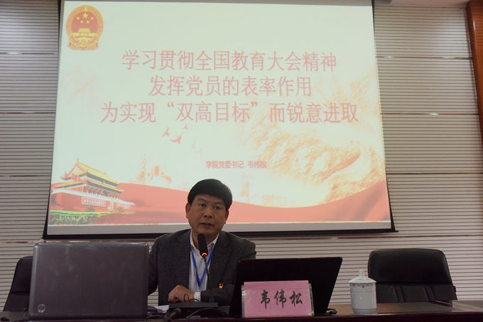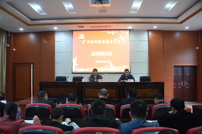 我院召开全体党员大会 11月13日,我院在第二学术报告厅召开全体党员大会,集中学习贯彻全国教育大会精神。学院党委书记韦伟松、副院长韦胜东、纪委书记张斌、南宁职业技术学院商学院原院长韩江河等领导出席会议,全体教师党员参加会议,会议由学院党委副书记、副院长霍江华主持。 学院党委书记韦伟松为全体党员做题为《学习贯彻全国教育大会精神,发挥党员的表率作用,为实现“双高目标”而锐意进取》的专题报告。韦伟松向全体与会人员介绍了全国教育大会的情况,传达了习近平总书记重要讲话精神。他表示,党中央在北京召开的全国教育大会,深入分析研究了教育工作面临的新形势新任务,对当前和今后一个时期教育改革发展作出战略部署,为新时代教育事业构划了蓝图、指明了方向。韦书记强调,全体党员教师,要认真学习领会、深入贯彻落实全国教育大会精神,落实立德树人根本任务,努力加强师资队伍建设,提升自身的素养,成为“四有”合格教师。要结合我院实际,践行3种精神、4个勇于、5个不怕,打造良好的精气神,做正能量的表率;要围绕创建双高学校,突破难点,做克难攻坚的表率;要围绕全面推进基层党建工作,做履行职责的表率;要全面推进质量诊断改进,做抓紧抓实的表率。 会上,霍江华副书记传达上级有关党建工作文件精神,并传达了习近平总书记给中央美院学院老教授重要回信精神。他表示,全体党员教师要切实增强教书育人的使命担当,立足岗位,体系的、深刻的学习会议精神,为助推学院发展贡献力量。