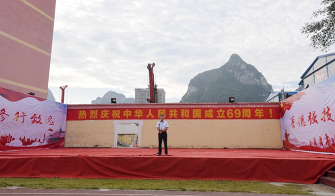 9月30日,我院在田径场举行升国旗仪式,共同庆祝中华人民共和国成立69周年。学院党委书记韦伟松、院长黄绍光,党委副书记、副院长霍江华,副院长韦胜东、副院长冯忠伟出席。全体师生参加。仪式由学工处处长李铃主持。 在全体师生的注目礼下,英姿飒爽的国旗护卫队队员们迈着整齐的步伐,护送鲜艳的五星红旗入场。伴随着庄严雄壮的《中华人民共和国国歌》,五星红旗在晨光中冉冉升起,迎风飘扬。全体师生高唱国歌,表达对祖国的热爱和崇高的敬意,共祝祖国母亲繁荣昌盛。 学院党委副书记、副院长霍江华发表了国旗下讲话。霍江华首先表达了对祖国欣欣向荣的美好祝愿,并指出,今年恰逢中国改革开放40周年,举行升旗仪式也是一次重要的爱国主义教育活动。只有铭记历史、缅怀先烈,才能拥抱光明未来;唯有传承先烈风骨,才能挺起民族脊梁。希望师生们心怀祖国,不懈奋斗,为实现中华民族伟大复兴的中国梦贡献力量。霍江华强调,全体师生在国庆放假期间要特别注意出行、防盗、防火、防骗、防溺水、防意外伤害和饮食等方面的安全,并按时返校。
