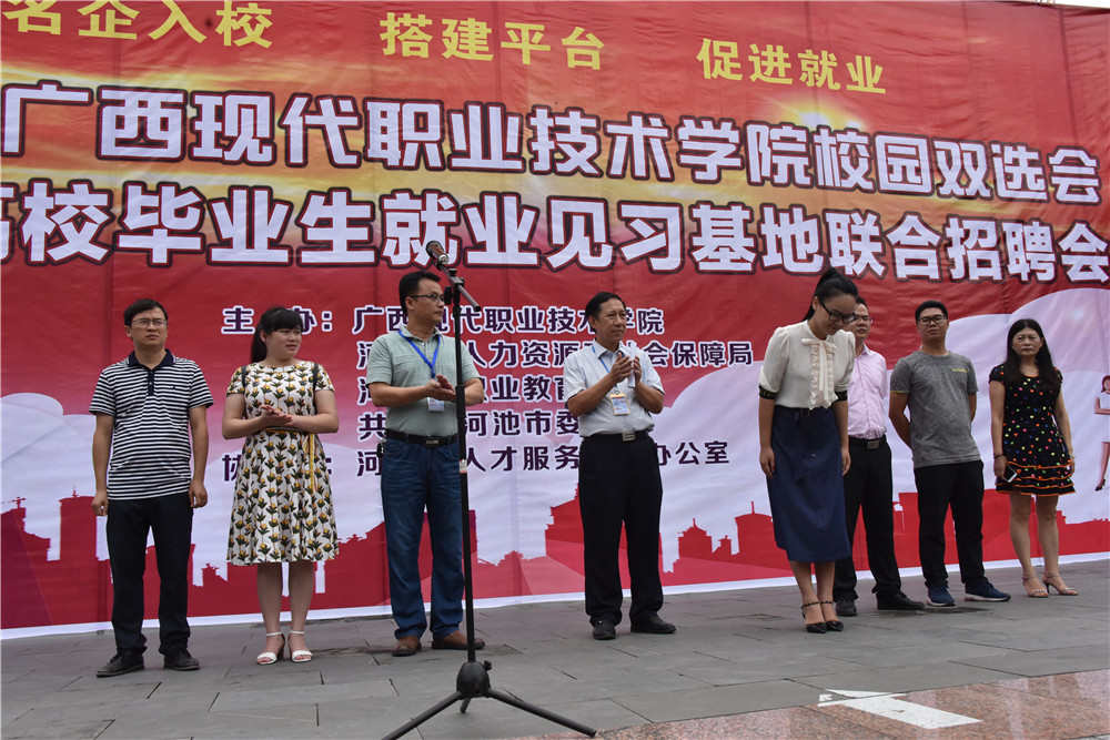 6月29日上午,由我院以及市人力资源和社会保障局、市职业教育集团、共青团河池市委员会主办的2019年大型校园双选会在我院隆重举行。副院长韦胜东、共青团河池市委员会相关负责人、各系分管就业的领导出席双选会启动仪式。院长助理、经管系主任杨奎主持启动仪式。