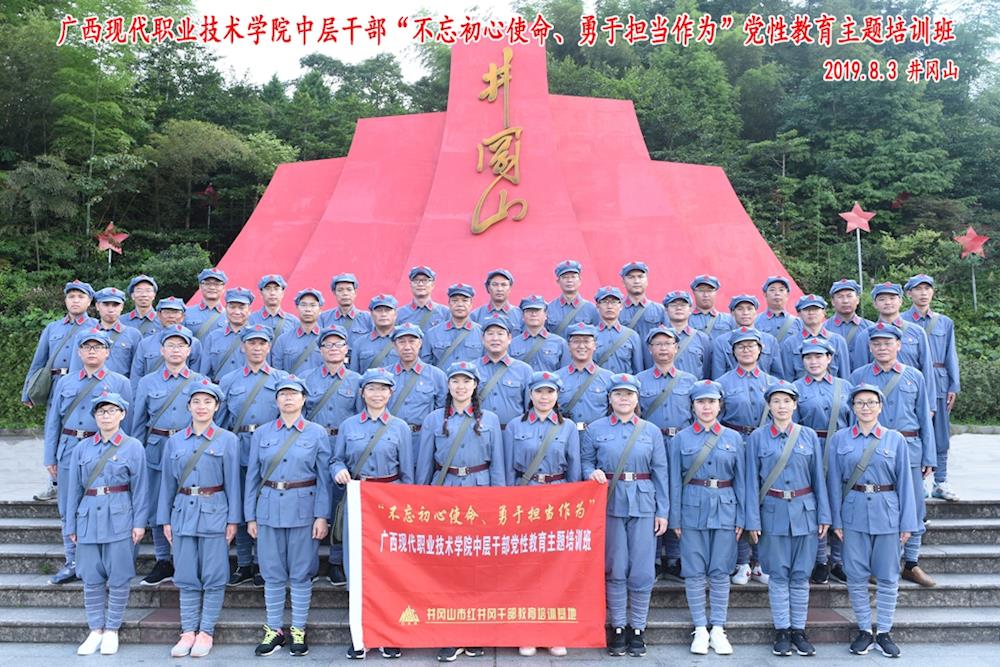 为深入学习贯彻党的十九大精神以及习近平总书记在“不忘初心、牢记使命”主题教育工作会议上的重要讲话精神,进一步提升学院中层干部政治素养和政治站位,提振精神,8月2日至8月8日,学院党委书记韦伟松、副院长韦胜东带队,我院34名中层干部代表前往井冈山,参加了“不忘初心使命 勇于担当作为”党性教育主题培训班培训学习。