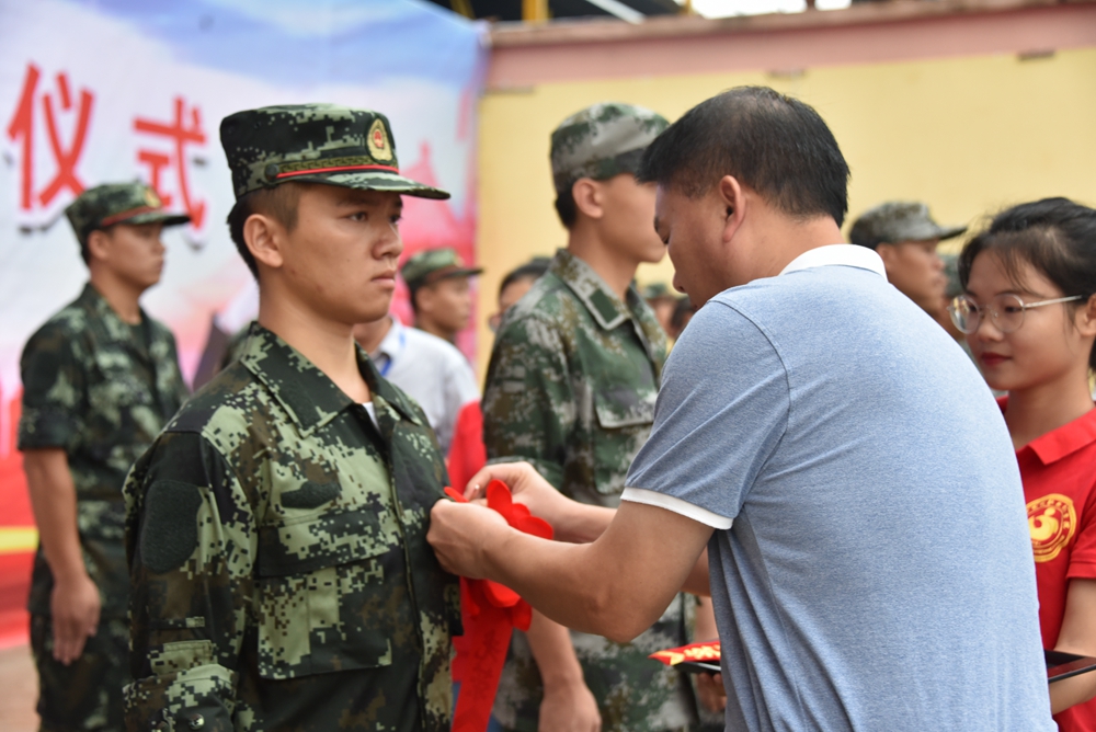 仪式上,韦胜东副院长宣读我院2019年在校应征入伍的学生名单,黄绍光院长给入伍学生颁发入伍通知书,学院领导给学生佩戴光荣花。