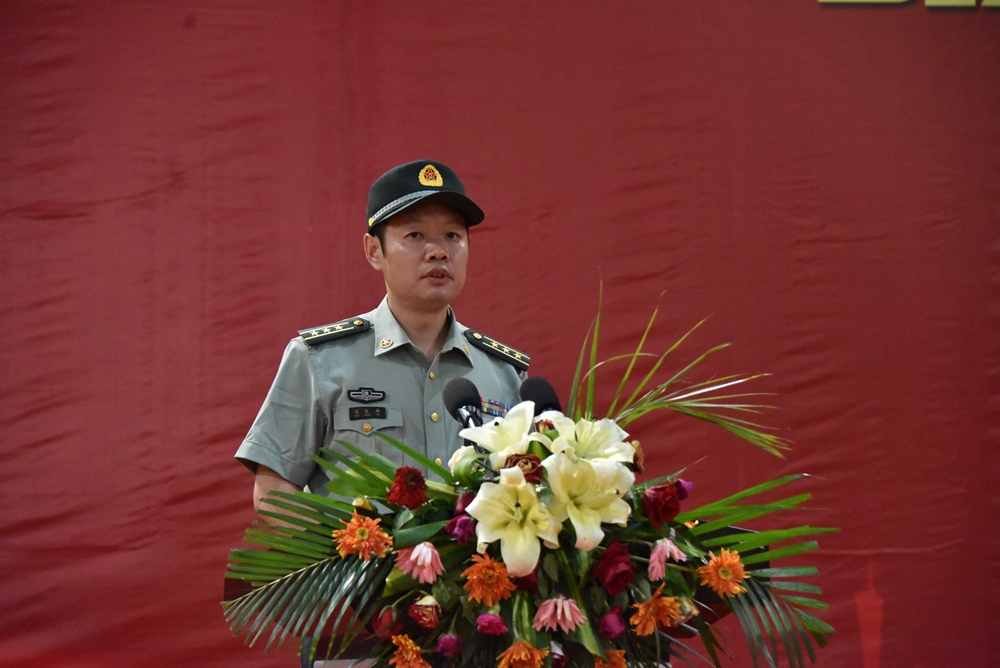 张斌书记首先代表学院向承担施训任务的教官们表示诚挚的感谢,向参加军训的2019级新生表示亲切的慰问和良好的祝愿。他指出,军训是锻炼同学们健康的体魄、顽强的毅力的一次机会,是同学们树立爱国爱校意识、全面提高综合素质的一次机会,是大学生活里的重要一课,对大家的成长成才具有十分重要的意义和深远的影响。他向全体参训学生提出三点要求:第一,忍得炎热,耐得枯燥,端正态度,顽强意志;第二,团结友爱,互帮互助,一起克服军训中所遇到的困难和挫折;第三,严守纪律,争当标兵,做到坚决服从命令,一切听从指挥,要以高昂的热情和不懈的努力,赢得军训最后的胜利,为学校、为父母交上大学第一份优异的成绩。