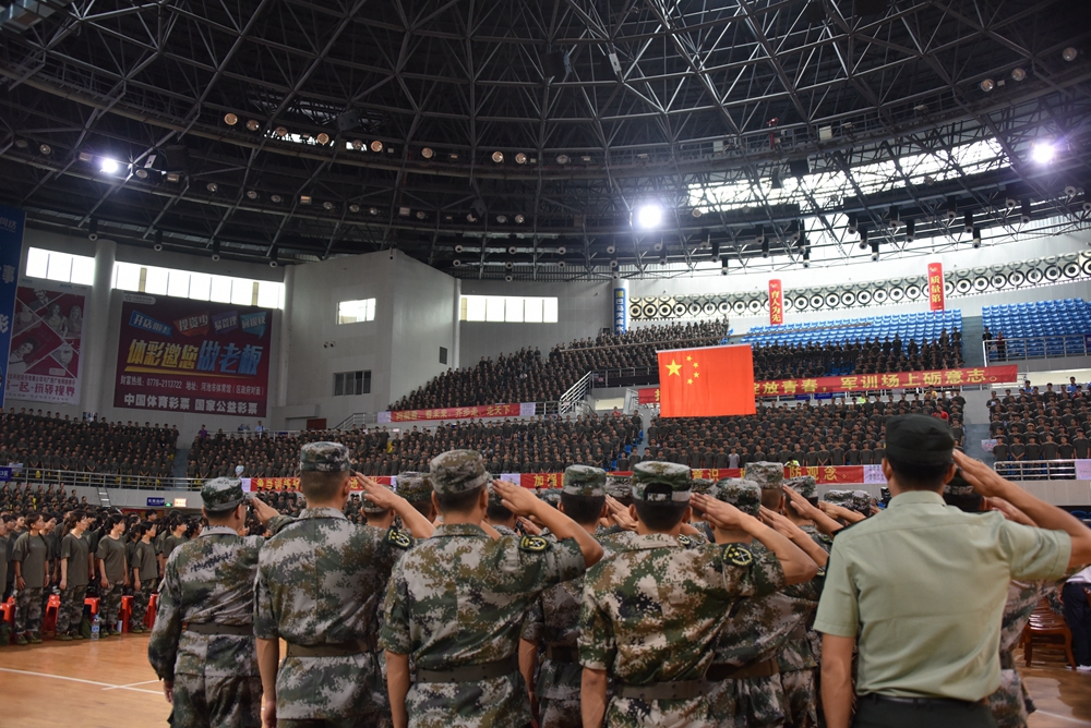 2019年9月16日上午,我院2019级新生军训动员大会在河池市体育馆隆重举行。学院纪委书记张斌、副院长冯忠伟,河池市金城江区人民武装部部长彭良辉,院长助理杨奎、覃孜,河池市消防救援支队防火处助理黄学杰等出席大会。学工处、团委、教科处、宣传部、后勤处、保卫处等部门主要领导,各系主任、党总支书记及团总支书记,75名承训教官与近4000多名2019级新生参加了动员大会。大会由学工处处长李铃主持。