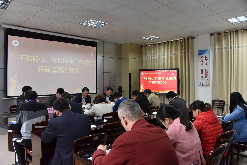 近日,学院“不忘初心 牢记使命”主题教育开展情况汇报会在一号办公楼五楼会议室召开。学院党委书记韦伟松,党委副书记、院长黄绍光,副院长韦胜东,纪委书记张斌及学院各党总支、党支部书记,党委办、组织部、宣传部、纪检办主要负责人出席会议。