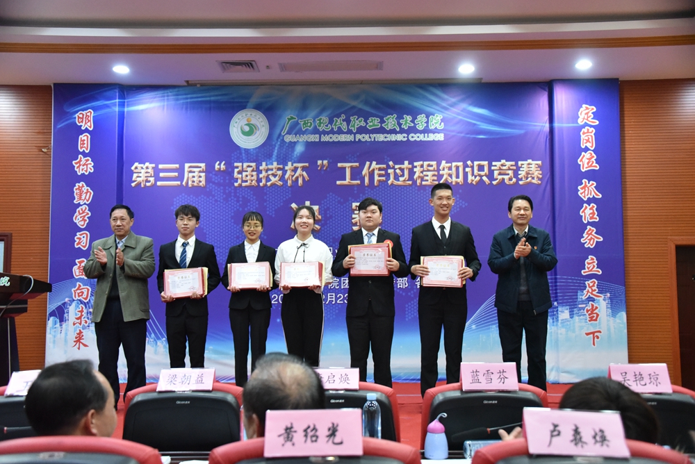 定岗位抓任务立足当下,明目标勤学习面向未来——我院第三届“强技杯”工作过程知识竞赛于12月23日下午在第二学术报告厅举行。学院院长黄绍光、副院长韦胜东出席本次比赛,市职业教育中心学校副校长唐启焕莅临现场观看并担任评委。本次决赛采用现场直播方式进行,在第二学术报告厅设主会场,各个教室进行现场直播。