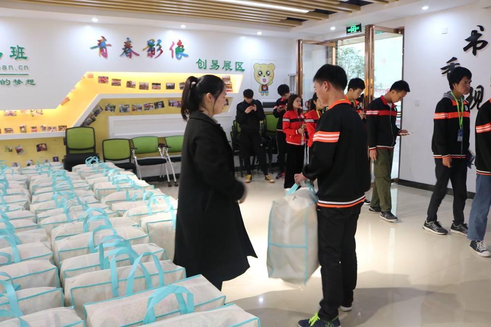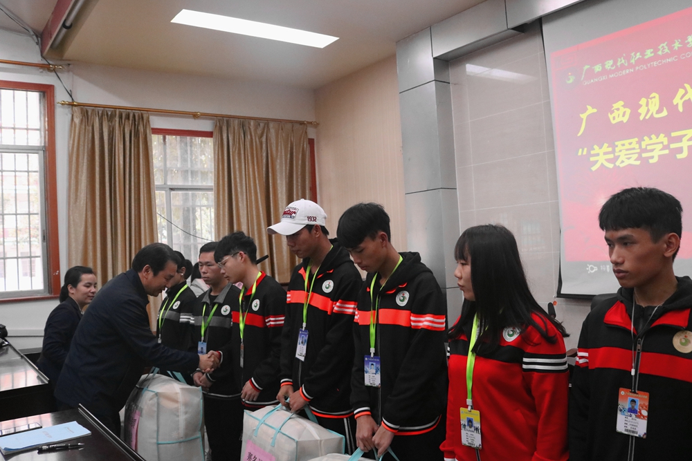 随后院长黄绍光、院长助理覃孜、学工处处长李铃给予学生代表赠送冬季暖心包,并到喷泉广场一起合影。本次活动充分体现了学院全体师生对贫困学子的爱心,真正把学院的关爱、温暖送到每个学子的心坎上,使他们切身感受到学院这个大家庭的温暖。