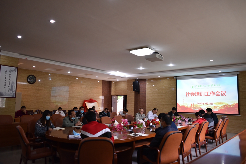 4月26日下午,我院在图书馆会议室召开社会培训工作会。学院党委书记韦伟松、院长黄绍光,副院长杨奎、卢森焕、黄耀,总顾问覃志航出席会议,各系、财务、后勤、教务等相关部门主要负责人、培训部全体成员参加会议。会议由党委书记韦伟松主持。