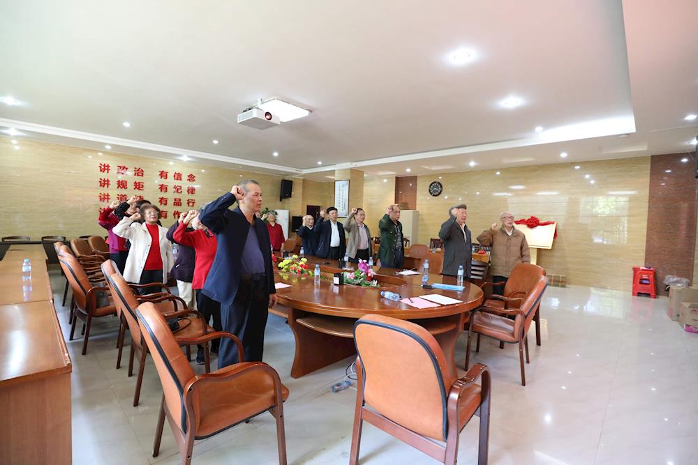 座谈会后,离退休教职工党支部召开支部党员大会,支部书记韦寿恒同志以《我们也是追梦人》为题,给支部全体党员上党课。全体党员重温入党誓词。