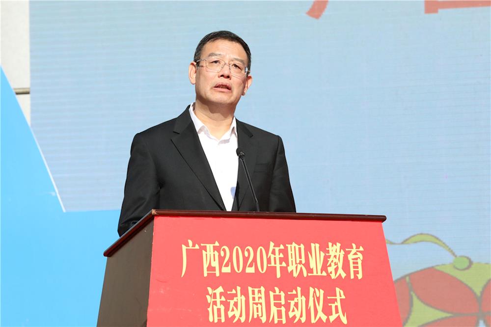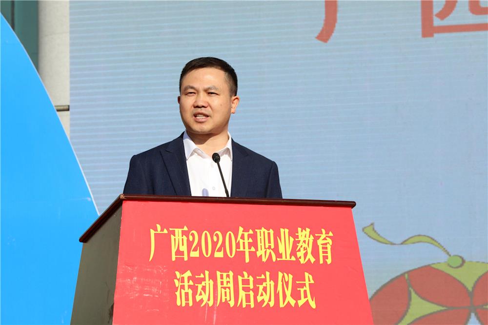 唐咸仅在仪式上讲话。唐咸仅指出,这次职业教育活动周是在我国即将迈入全面建成小康社会、迎来实现第一个百年奋斗目标的重要时间节点举办的,意义非凡,十分重大。这将是充分宣传党和国家职业教育方针政策的大平台,充分展示广西职业教育改革发展成果的大窗口,充分彰显新时代广西职业教育先进典型的大阵地。举办这次职业教育活动周,主要目的是贯彻落实党的十九届五中全会精神,大力宣传贯彻国家和自治区职业教育改革实施方案,充分展示党的十九大以来广西职业教育取得的丰硕成果和经验做法,号召全社会关心支持职业教育大改革、大发展。围绕“人人出彩,技能强国”的主题,全区职业院校通过线上线下相结合的方式,分享职业教育发展成果,充分展示严谨认真、精益求精、追求完美的工匠精神。唐咸仅希望,各参与部门加强协调沟通,各地教育行政部门做好牵头组织工作,共同做好活动周这篇大文章;希望加大力度宣传党和国家发展职业教育的方针政策和决策部署,引导社会各界更深入、更全面地认识职业教育作为类型教育的重要地位,让职业教育承载更多梦想;希望行业企业和社会各界广泛参与活动周各项活动,共同投身到职业教育改革发展的时代洪流;希望扎实做好活动周各项主题活动,广泛宣传,扩大影响,大力营造职业教育发展的良好舆论氛围,让尊重职业教育在社会蔚然成风。