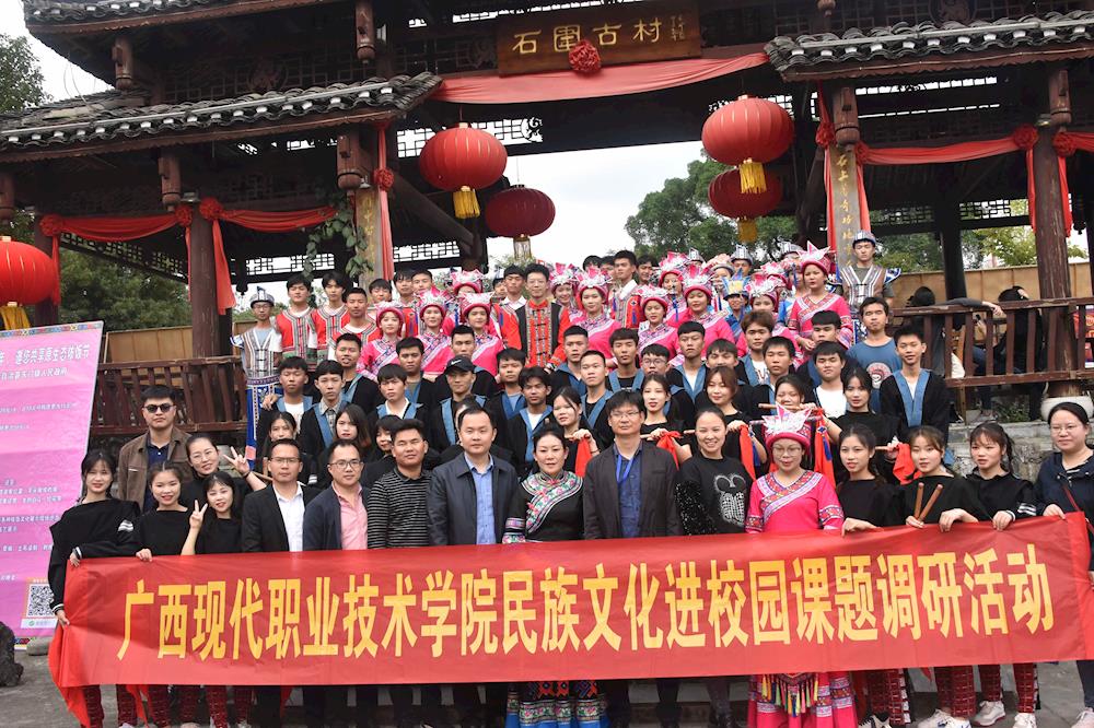 为继承和弘扬民族文化和区域民族文化精髓,进一步完善我院师生民族文化体系,培养师生爱祖国、爱家乡、民族团结的高尚品德,树立正确的人生观、道德观、价值观,使传统民族文化精髓内化于心、外化于行,11月21日上午,共青团河池市委副书记、广西现代职业技术学院建筑工程系党总支书记黄菁,带领我院师生一百余人到河池市罗城仫佬族自治县石围村,开展民族文化进校园“依饭节”活动。