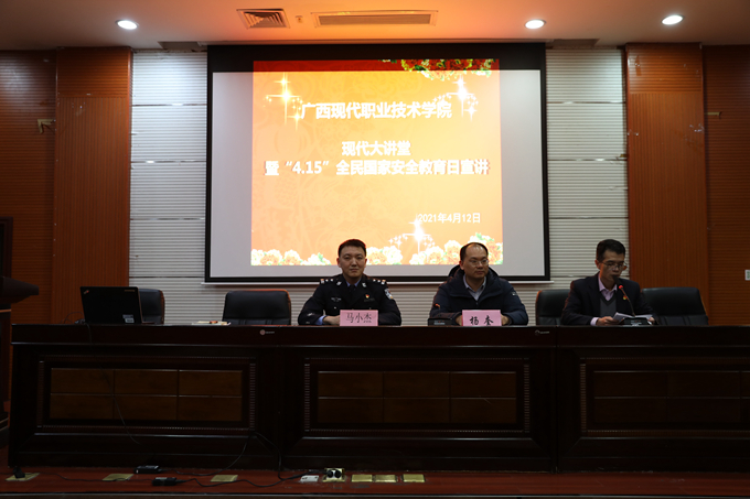为切实加强国家安全、反奸防碟等宣传教育,增强全院师生国家安全意识,依法履行维护国家安全的责任和义务,4月12日晚,河池市国家安全局马小杰副局长受邀到我院参加“4.15”全民国家安全教育日宣讲活动,为师生们上了一堂精彩的国家安全教育宣讲课。学院杨奎副院长出席宣讲会,学院保卫处、学生工作处、党委宣传部相关负责人,各系党支部书记及师生代表参加学习。会议由法制保卫处副处长韦俊主持。