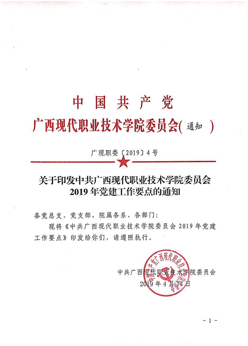 广现职委[2019]4号-关于印发中共广西现代职业技术学院委员会2019年党建工作要点的通知 来源: 发布时间:2019-04-18 09:12:13 浏览次数: 次 【字体:小 大】 终审:gxxdxcb003 【打印正文】 相关信息