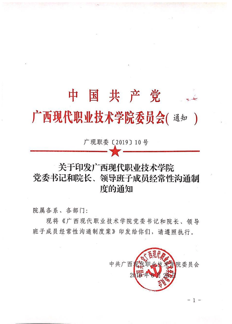 广现职委[2019]10号-关于印发广西现代职业技术学院党委书记和院长、领导班子成员经常性沟通制度的通知 来源: 发布时间:2019-06-27 09:15:41 浏览次数: 次 【字体:小 大】 终审:gxxdxcb003 【打印正文】 相关信息
