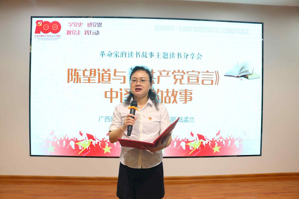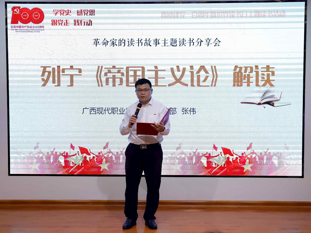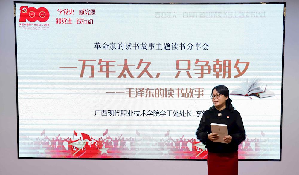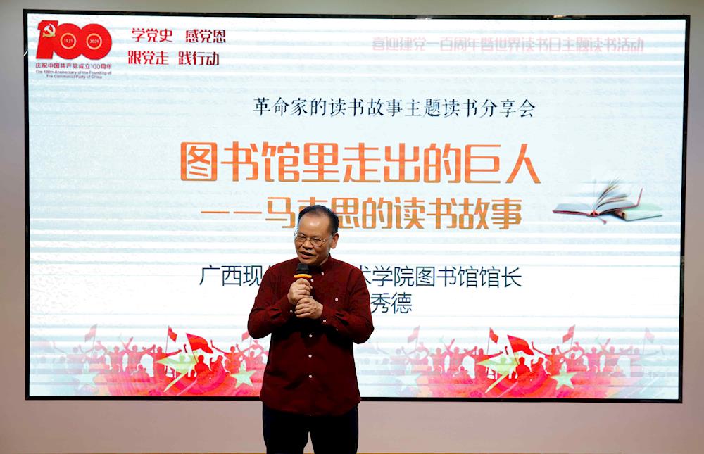 这是我院为迎接建党百年,于4月23日世界读书日当天下午在河池市新华书店举办的“革命家读书故事”主题读书分享活动现场。本次活动由图书馆、思政部、学工处联合举办,由建筑工程系党总支与河池市新华书店有限公司共同协办。河池市新华书店副总经理杨程出席本次活动并致欢迎辞。活动以“探索真知,改造世界”为主题,师生们分别讲述了马克思、列宁、毛泽东等思想家、革命家的读书故事。