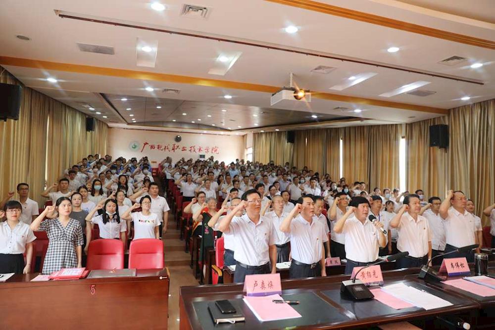 在庄严的宣誓词结束后,韦伟松书记作了总结讲话。他首先向刚才宣誓入党的新党员同志们,及受到表彰的优秀共产党员、优秀党务工作者和先进基层党组织表示热烈地祝贺,向“光荣在党50年”的老党员表示崇高的敬意。他指出,过去的一百年,是中国共产党筚路蓝缕探索、矢志不渝奋斗的一百年,带领中国人民实现了“四个伟大成就”;过去一年,学院党委在党的坚强领导下,带领全体师生实现了学院事业高质高效发展。在奋斗“十四五”的新征程上,他对全体党员提出了三个要求:一是要进一步提高政治站位,强化责任担当;二是要持续抓好党史学习教育,强化思想引领促发展;三是要牢记为党育人、为国育才使命,履行好育人教书职责。全体党员们要不负韶华,敢当先锋,争做表率,将对党的一腔热情和一腔忠诚化作改革创新的动力,勇担学院改革发展使命,在学院高质量发展新征程上扬帆起航、破浪前行,以优异的成绩献礼党的百年华诞。