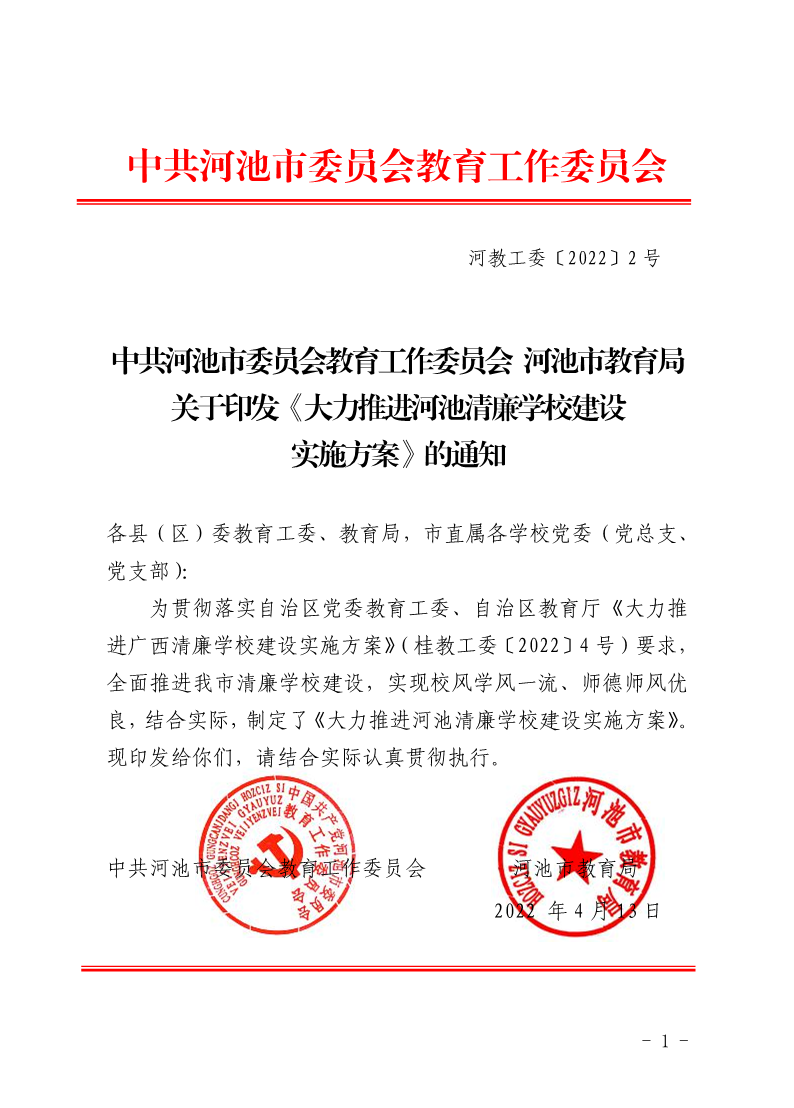 河教工委[2022]2号 中共河池市委员会教育工作委员会 河池市教育局关于印发《大力推进河池清廉学校建设 实施方案》的通知 来源:纪检办 林鹏羽 发布时间:2022-04-15 11:43:02 浏览次数: 次 【字体:小 大】 终审:gxxdxcb001 【打印正文】 相关信息