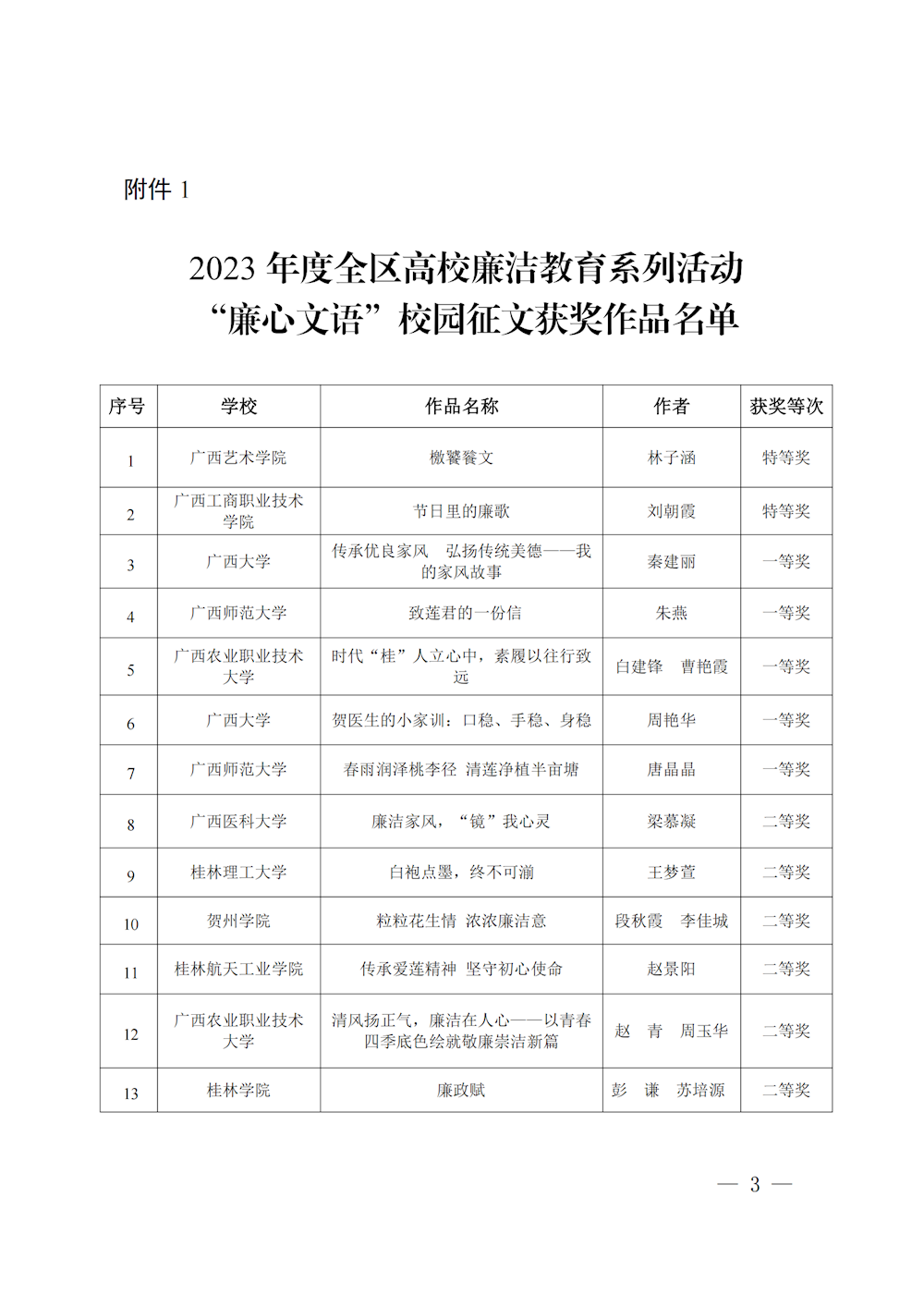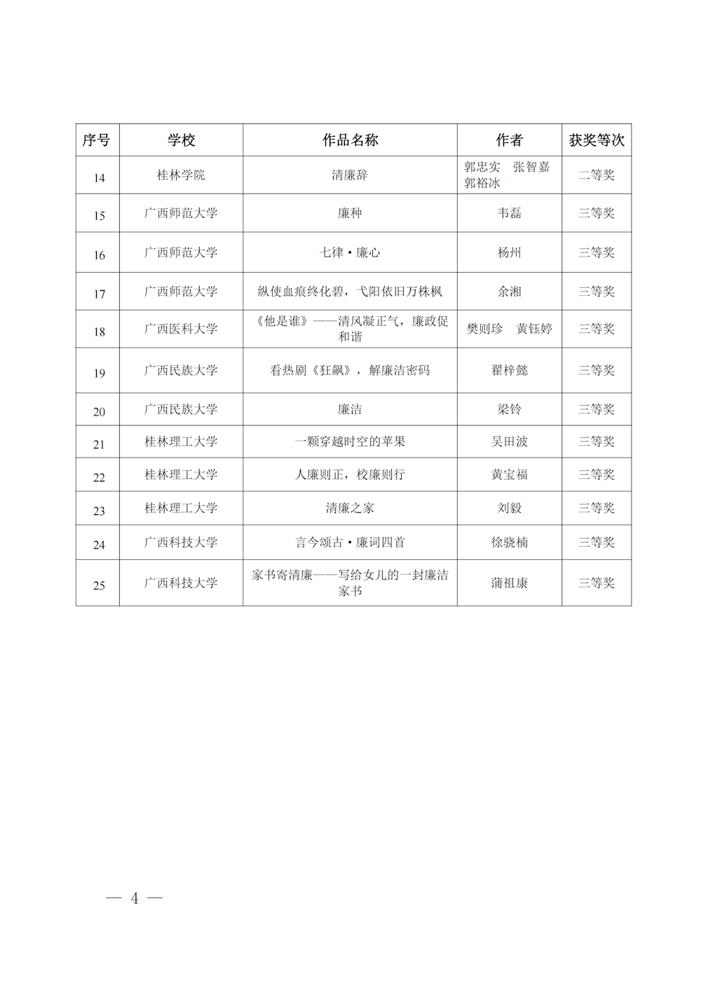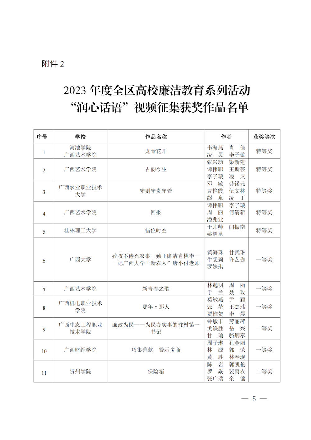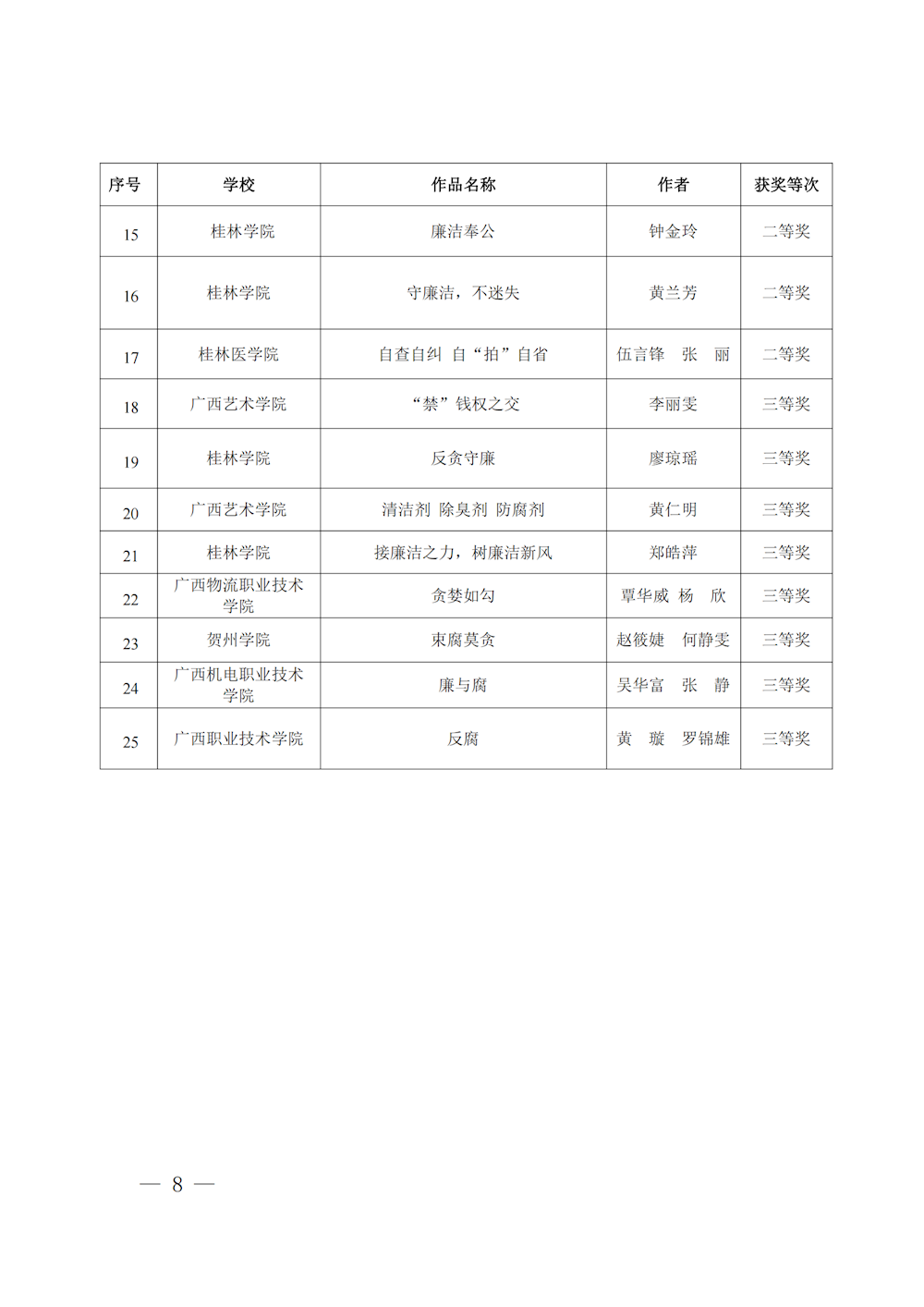 桂教工委办〔2023〕147号自治区党委教育工委办公室关于公布2023年度全区高校廉洁教育系列活动评选结果的通知 来源:广西壮族自治区委员会教育工作委员会办公室 发布时间:2023-11-01 16:15:18 浏览次数: 次 【字体:小 大】 终审:gxxdxcb007 【打印正文】 相关信息