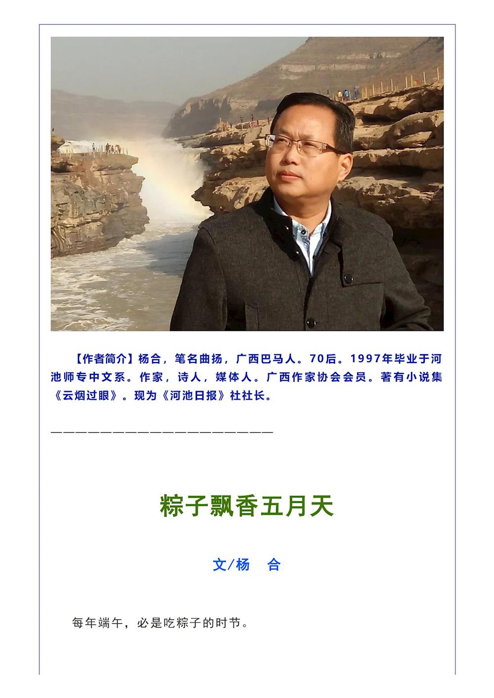 [老鸟传媒·壮乡寿源粽专栏]青年作家杨合作品:粽子飘香五月天 来源:老鸟传媒 发布时间:2022-12-19 12:45:20 浏览次数: 次 【字体:小 大】 终审:gxxdxcb004 【打印正文】 相关信息
