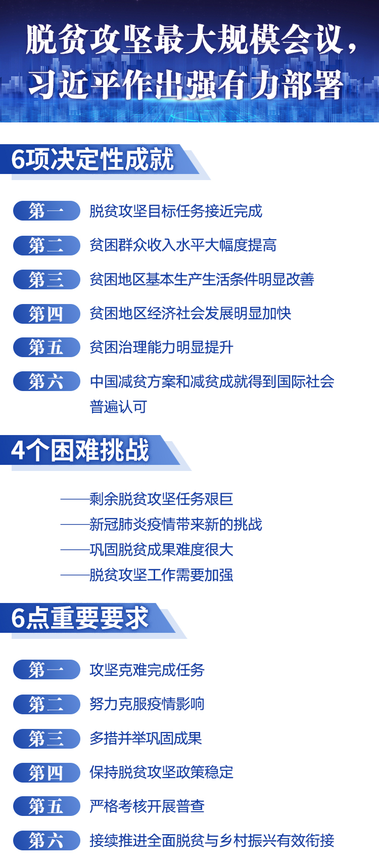 脱贫攻坚面临的困难和挑战依然艰巨,决不能松劲懈怠。3月6日,在战“疫”处于“最吃劲的关键阶段”,习近平在决战决胜脱贫攻坚座谈会上发表重要讲话,强调“以更大决心、更强力度推进脱贫攻坚,坚决克服新冠肺炎疫情影响,坚决夺取脱贫攻坚战全面胜利”,吹响决战决胜脱贫攻坚的总攻号角。