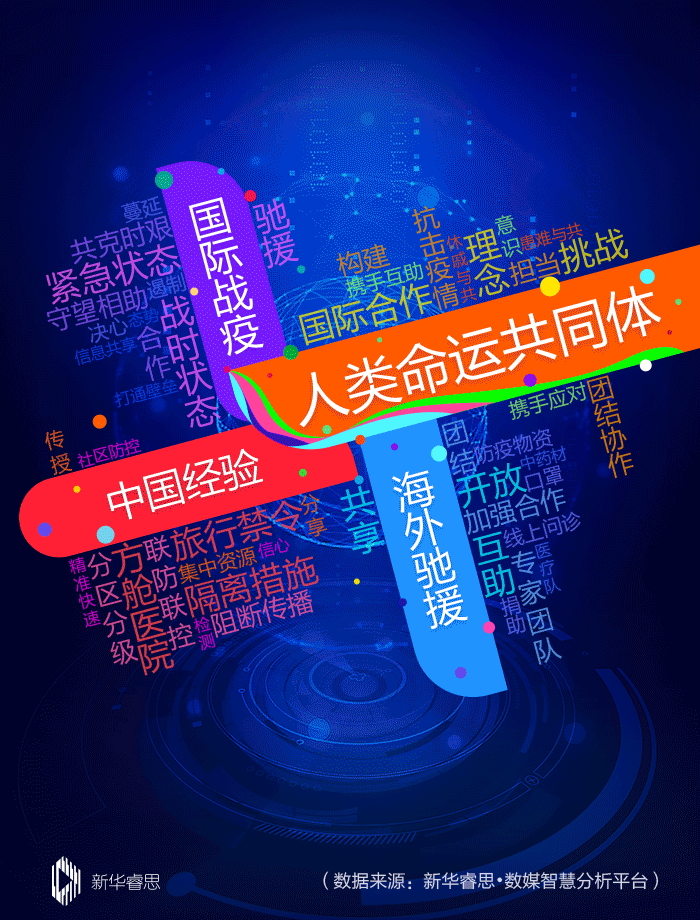 新华睿思持续跟踪微博、抖音、今日头条等网上热搜榜高热话题,以及重大新闻事件,梳理出网友关注的热词集锦。根据关注度排行可以看出,“人类命运共同体”“国际战疫”“中国经验”“海外驰援”四个关键词位居前列。同时,“国际合作”“战时状态”“方舱医院”“共享”“开放”“互助”等成为热搜词汇。