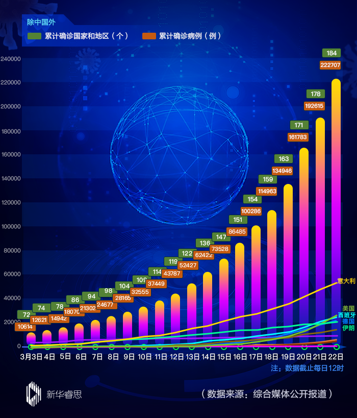 根据世界卫生组织22日公布的最新数据,中国以外新冠肺炎确诊病例20多万。目前,欧洲已成为疫情“震中”,美国宣布进入“国家紧急状态”,中东多国“封城”,拉美、非洲多国报告确诊病例……随着新冠肺炎全球确诊病例持续快速增加,网友对全球疫情进展情况的关注度迅速升温。